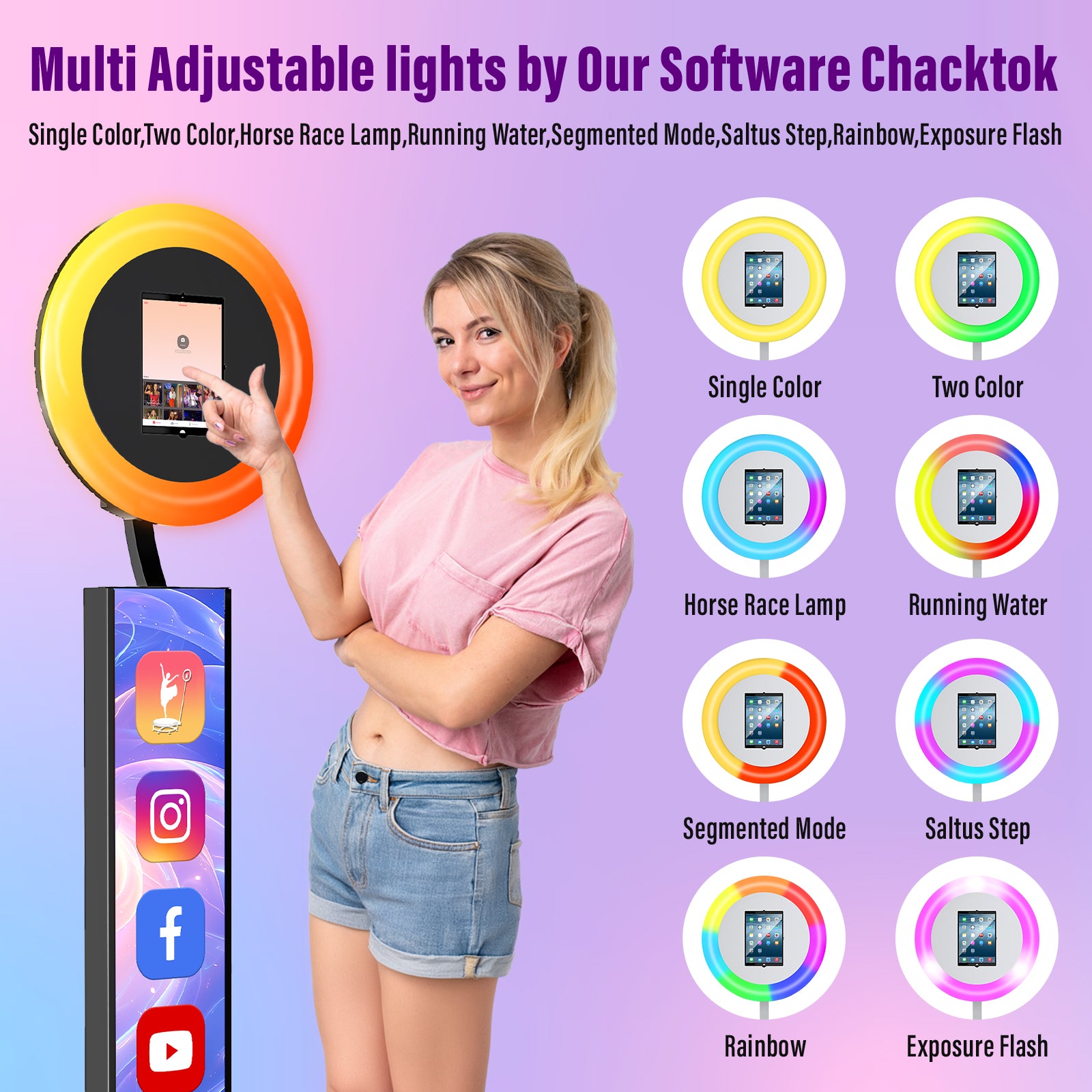 - 【Exclusive Advantage Software Chacktok】:At present, the number of users using Chacktok software has reached millions,chacktok software not only control the brightness, saturation, and color temperature of RGB Light Ring,but also Create activities, standardize shooting processes and preset effects, and greatly improve shooting efficiency.Notes:It takes about a week from the time of ordering to receiving ipad photo booth